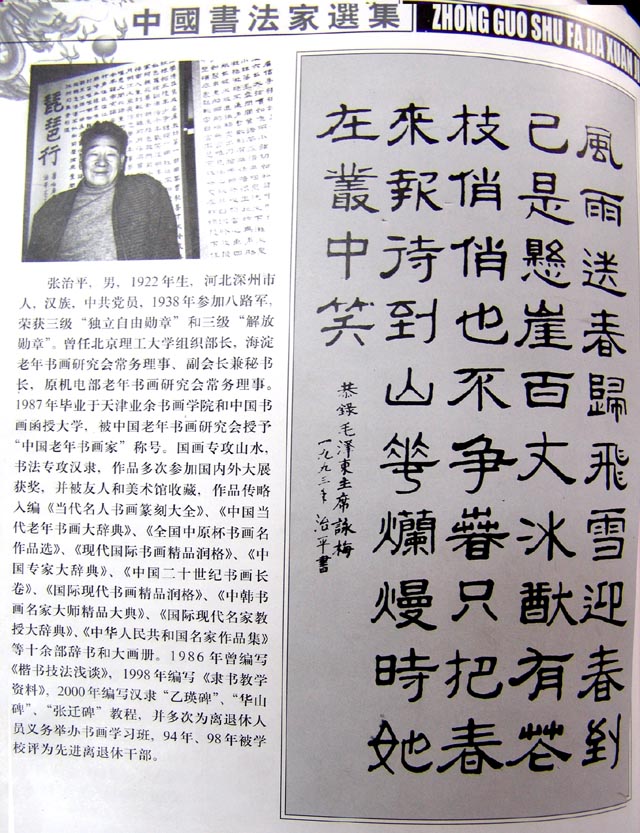 张治平先生曾任我校组织部部长,离休后专攻书法,并入选中国书法家行列。