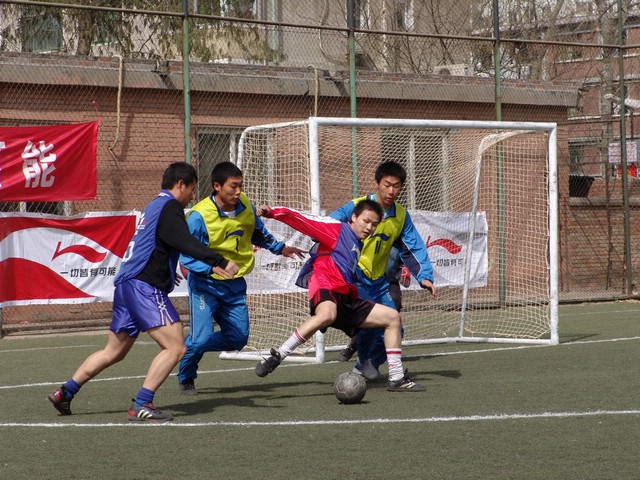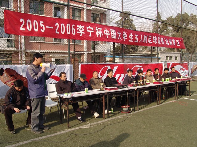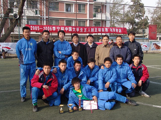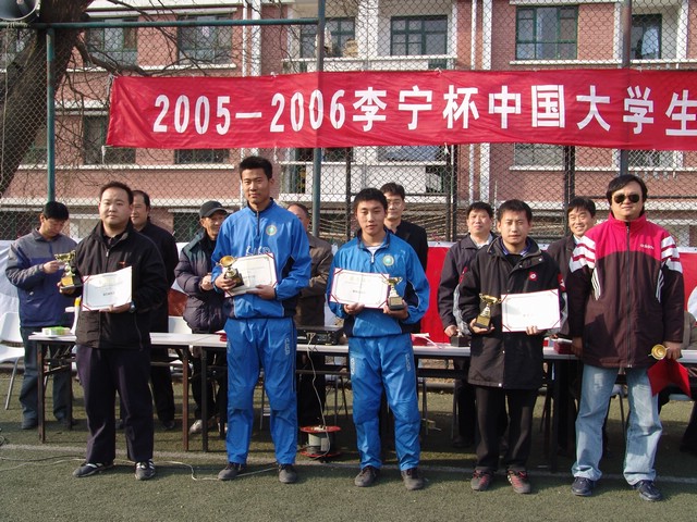3月26日下午,在中国人民大学体育场进行了“2005-2006李宁杯中国大学生五人制足球联赛”北京赛区的决赛,我校足球队顽强拼搏,不畏强敌,以1:0战胜清华大学队,夺得北京赛区冠军。