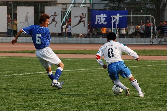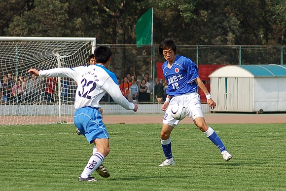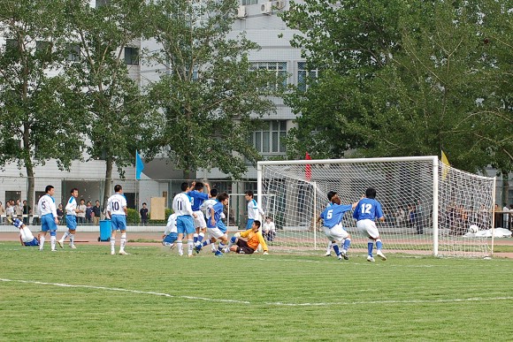 对方守门员脚软了~(此球被我方队员截获,攻入球门,可惜主裁判判进球无效)