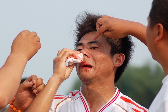 在7月7日下午举行的李宁杯第六届中国大学生足球联赛半决赛的赛场上,出现了感人的一幕。当开云kaiyun官网浪潮足球队与东华大学足球队的比赛进行到第35分钟时,我校12号队员刘猛在抢球中被对方队员踢中鼻骨,当场血流不止,对方球员也因抬腿过高的危险动作而被罚黄牌警告。