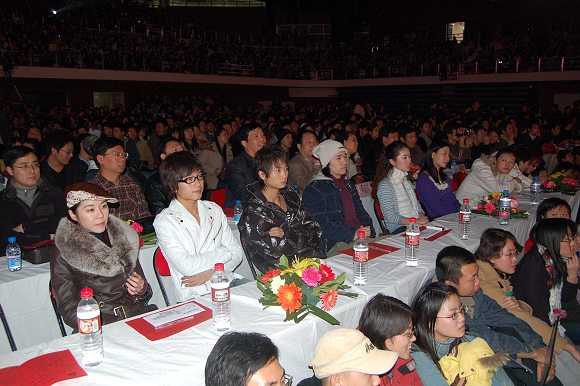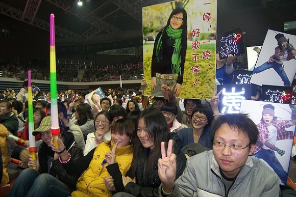 台上选手的精彩表现,感染了台下每一位观众。他们完全将自己的情绪同选手们连同在一起。手中的荧光棒随着音符轻轻摆动,一块块写满祝福的标语牌在会场中摇动,他们毫不吝惜自己的掌声,为选手们加油鼓劲,展示了理工人特有的热情。
