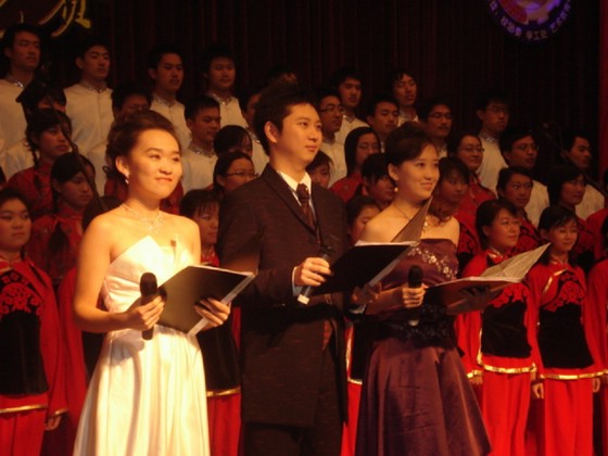 比赛于7点钟准时开始,这次歌咏比赛的主持人是来自管理与经济学院的崔乐洋、聂晓愚、温晓萌三位同学,比赛开始前,先由主持人介绍了到场的评委以及来宾。我校党委副书记常务副校长杨斌同志以及校团委的领导等出席比赛现场莅临指导,更有长征组歌的作曲之一的著名老一辈革命作曲家、总政歌舞团著名指挥家等著名音乐人士出席本次比赛担当评委。