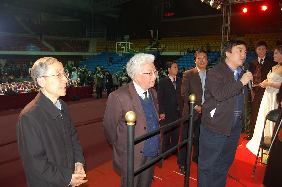 党委副书记、副校长杨宾和毛二可、周立伟二位院士在演出结束后慰问和鼓励演出人员。