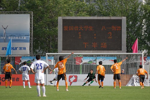 但接着就在爱国者队进球刚刚后一分钟,队员的兴奋情绪尚未平息下来时,八一队员反击突入禁区,面对守门员的正常扑救,以一个“疑似假摔”的动作使得爱国者大学生队被判罚点球,八一队里浩主罚命中。八一3:1领先爱国者大学生队,此球使刚刚燃起扳平希望的爱国者大学生队的情绪也遭受沉重打击,可谓整场的转折点。比赛进行到69分钟,八一队37号外援利马再次利用个人能力,撕破了爱国者大学生队的防线,将比分锁定在4:1。