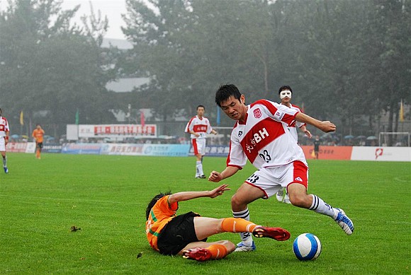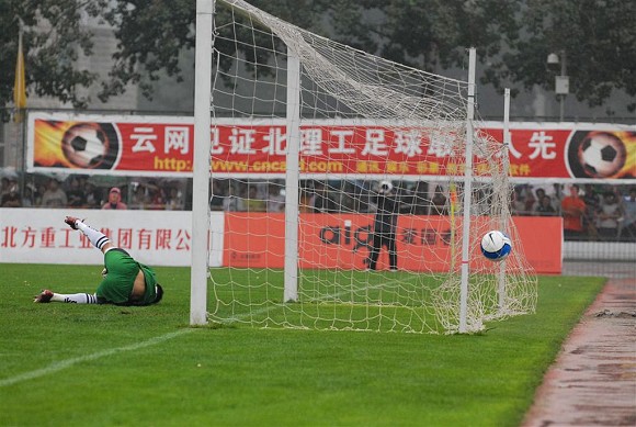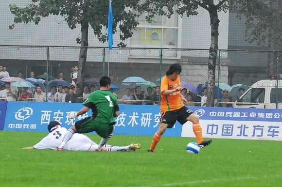 虽然北京昨天天降大雨,但北理工主场依然来了大量球迷,除了在校学生外,大批没有球票的球迷站在场边的铁丝网外看完了比赛。在球迷的助威声中,学生军向宏登队发起了一次次的进攻。第12分钟,前锋杨思源突入禁区后小角度打门,被宏登门将扑出。