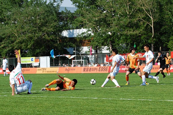 第22分钟,爱国者队张淼在禁区边缘向前突破被无锡中邦队员绊倒在地。