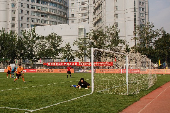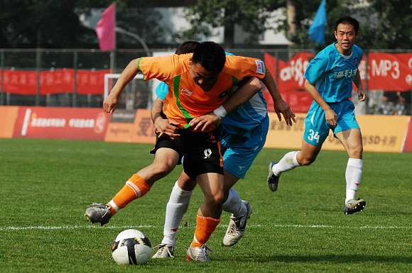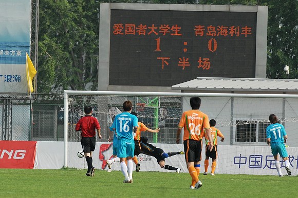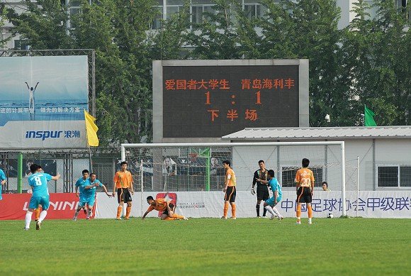 北理工球员卢斌将点球罚进,北理工主场获得领先。青岛海利丰丢球后,试图加强进攻力度,利用边路45度的斜传的方法组织进攻。