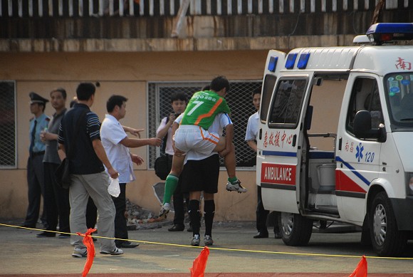 比赛一开始,北京理工队36号裴香俊单刀,可惜裁判吹罚越位在先。上半场进行到第11分钟,季俊、王博这对南昌八一队最有威胁的后腰组合打出精妙配合,王博将球分张书恺,张书恺传中,阿莱士射门前被对手北京理工队的7号徐鹏破坏,徐鹏也因此受伤直接上了救护车!