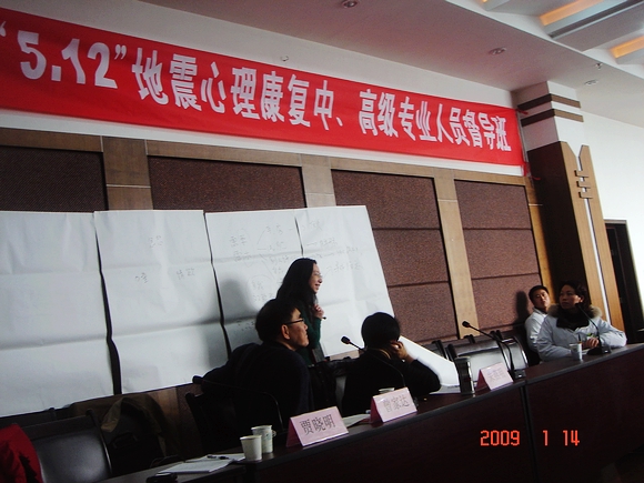 我校社会工作系主任、应用心理学研究所所长贾晓明教授于2009年1月11日到16日再次到四川灾区进行心理援助工作。此次四川之行,贾晓明教授与加拿大多伦多大学曾家达教授、香港朱燕明老师为四川5.12地震心理康复中、高级专业人员进行个案督导,答疑解惑,帮助心理专业人员提高对灾后心理创伤者的心理干预专业能力。