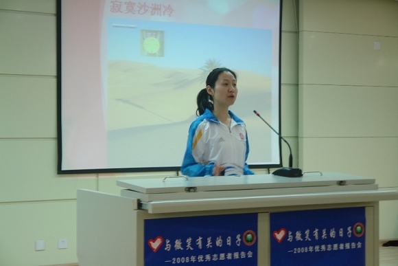 在报告会上,来自材料学院的张鹏、人文学院的黄霆、设计学院的计小莹,分别用生动幽默的语言,分享了自己的奥运志愿服务经历和收获。他们用一个个小故事讲述了在奥运志愿者大家庭中相互支持和帮助的《我的150个天使》,志愿者的在工作中那些《酸酸的快乐 甜甜的忧伤》,以及在20岁时那一年《1/20的收获》。报告团的“替补成员”校团委宣传调研部部长张巍老师,代替正在准备博士生入学考试的吴曼,讲述了“志愿者平方”是如何做到了《平凡的付出“平方”的爱》。