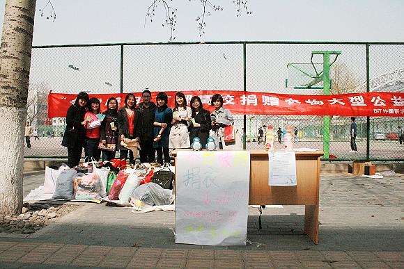 2009年3月17日至3月18日,外国语学院飞愿志愿者协会在我校新食堂对面举办了“冬日暖阳”首都高校大型衣物捐赠公益活动。