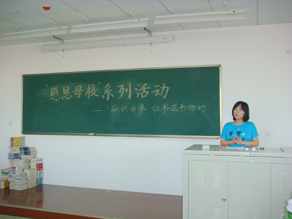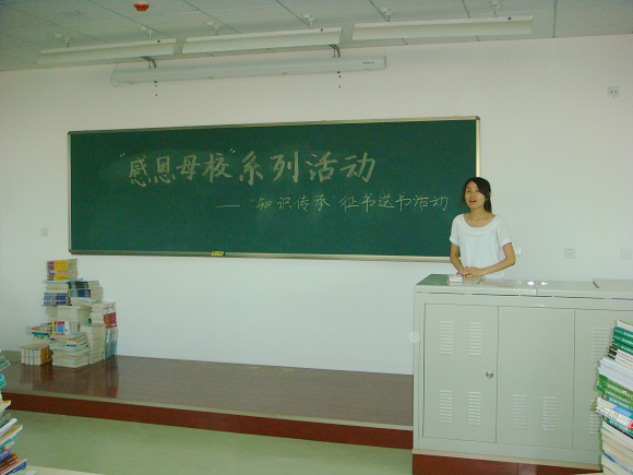 为了坚持全面协调可持续发展的基本要求,机电学院05级党支部举办了“感恩母校”系列活动之“知识传承”征书送书活动,将大四学生四年来所用的教材送给良乡校区的同学。6月9日下午,在良乡校区成功举办了交接仪式,机电学院07级辅导员徐莹莹老师,05级党支部党员以及07级的各班级干部参加了此次活动。