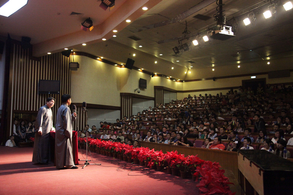 5月18日晚,中心教学楼报告厅座无虚席,近700名观众来到了“笑满理工”相声专场晚会现场。我校“单对群”相声社、首都高校相声联盟的同学们为广大师生、校友奉上了一场笑料层出、包袱不断的开心大餐。著名相声表演艺术家刘洪沂先生,著名相声演员何云伟,80后相声明星高晓攀及其团队“嘻哈包袱铺”作为嘉宾登台献艺。演员们专注投入的演出,引得大家开怀大笑并报以热烈掌声。经过近一年的尝试,“笑满理工”相声晚会已经成为校园文化艺术品牌活动,相声这门传统艺术在我校拥有了数量庞大、固定的受众群体。