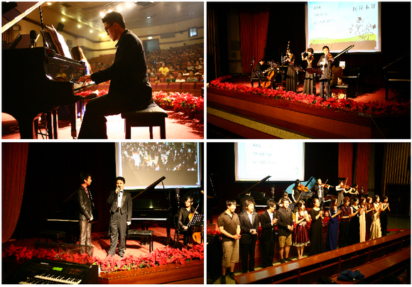 5月19日傍晚的小雨并没有阻碍大家感受音乐的脚步,“黑白键上的狂想”室内音乐会在中心教学楼报告厅拉开序幕。我校大学生艺术团键盘乐团与青年钢琴家代博、电影交响乐团联袂演绎了一场新颖、唯美的室内音乐会。特别是代博老师因为先天性青光眼,仅左眼拥有0.01的微弱视力,但是他完美的演奏和坚强的意志完全感染了现场观众,大家为被誉为“指尖的太阳”的代博老师报以热烈掌声。音乐会在《英雄》等古典音乐,《泰坦尼克号》、《美丽的神话》等电影音乐间穿梭,最后以一曲《友谊地久天长》落幕。