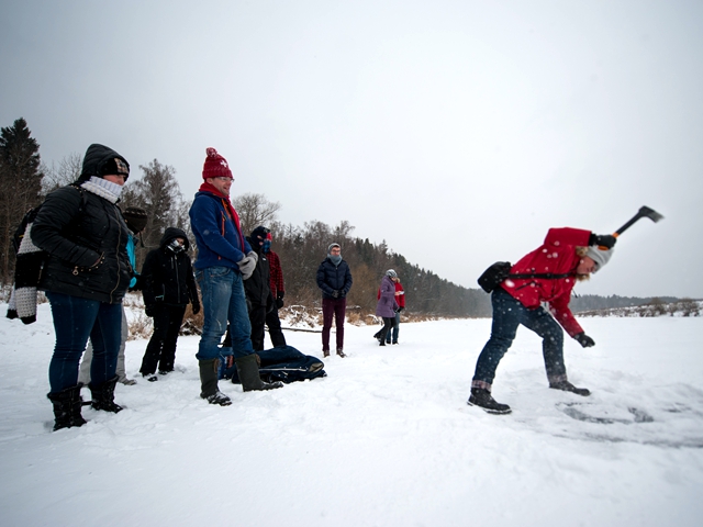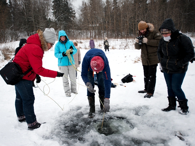 随后,科考团各小组结合课题实验设计,分别在多个地点采集水样、土壤样本、植物样本等,并在现场进行了简单的测试,记录相关实验数据。特别是-30℃的严寒及风雪天气下,莫斯科河结冰厚度50余厘米,水样采集难度非常大,北理工科考队员与同在生态站科考的美国、俄罗斯、克罗地亚学生一起,共同顺利完成了水样及水体下相关物质的采集。