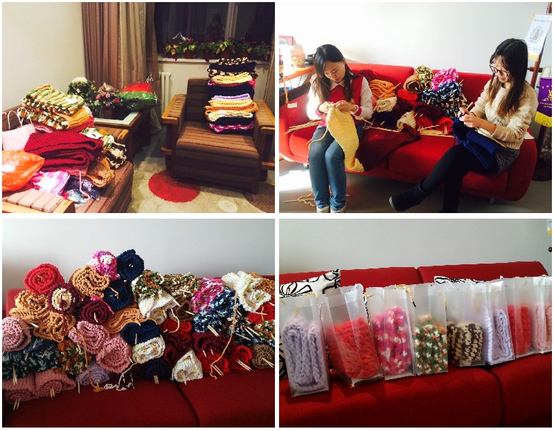 一个月后,一条条暖心围脖陆续完成。失独小组于12月16日开始进行回收工作。同学们满怀期待,将亲手编织的“作品”交到心理与社会工作实验室来,更有热心的同学完成了两条甚至更多的围脖。仅仅3天的时间,收到的围脖便堆积成山,载满了同学们在寒冷冬日中燃烧着的热情与爱心。失独小组成员们仔细将一条条即将完成的围脖收针封口,整齐放置到一个个精心挑选的包装袋中,将同学们的爱心以最美好的方式带给新希望家园的老人们。