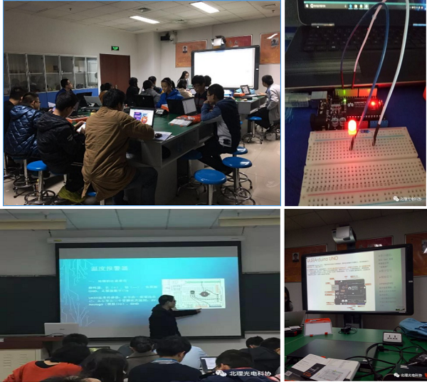为帮助同学们走近科学,初步了解开展实验所需的一些元器件,光电学院于2016年12月4日和2017年3月4日,分别在良乡大创基地——光电创新坊开展培训,主要利用Arduino学习套件,学习单片机编程思想、红外接收器、舵机、数码管、温度传感器等硬件原理。培训分三个部分。第一部分由科协杨心念介绍Arduino学习套件基本概念与主要用途,从形式多样的炫酷彩灯控制项目开始,逐一讲解数字信号控制原理及程序。第二部分由自动化学院董昊为大家讲解电机和舵机控制方法。第三部分由科协甘昕介绍了温度、光学、震动传感器相关软硬件原理和红外遥控项目等内容。这些课程大大满足了同学们的好奇心,大家纷纷交流互动,课堂气氛活跃。