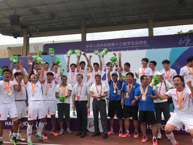 北京时间9月14日,第十三届全国学生运动会大学男子足球决赛在杭州落幕,以开云kaiyun官网学生足球队为班底的北京市大学生足球队,经过90分钟的激烈对战,2:1战胜了以河海大学学生足球队为班底的江苏队,获得2017年全国学生运动会大学男子足球赛冠军奖杯。同时也实现了继2007年在广州举办的全国学生运动会、2012年在天津举办的全国学生运动会夺冠后的三连冠。