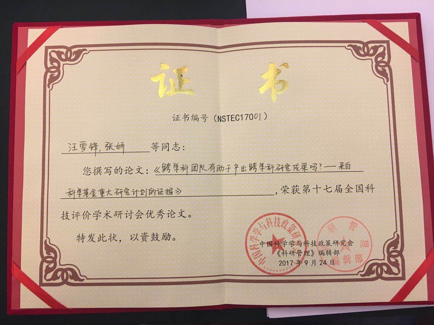 2017年9月23-24日,开云kaiyun官网知识管理与数据分析实验室2016级硕士生张娇在第十七届全国科技评价学术研讨会上获得优秀论文奖,并被组办方选择作为热点话题之一进行单独汇报讨论,受到与会学者的广泛关注,这也是实验室研究生连续第三年获此殊荣,进一步提升了我校在技术创新管理和科技评价领域的影响力,为我校赢得广泛赞誉。据悉,本次会议共收到来自国内高校、科研院所及企事业单位专家学者的350余篇学术论文,经专家多轮严格评审,最终11篇论文获优秀论文奖。中国科学学与科技政策研究会理事长穆荣平研究员,《科研管理》编辑部王萍主任为获奖作者颁发优秀论文证书。