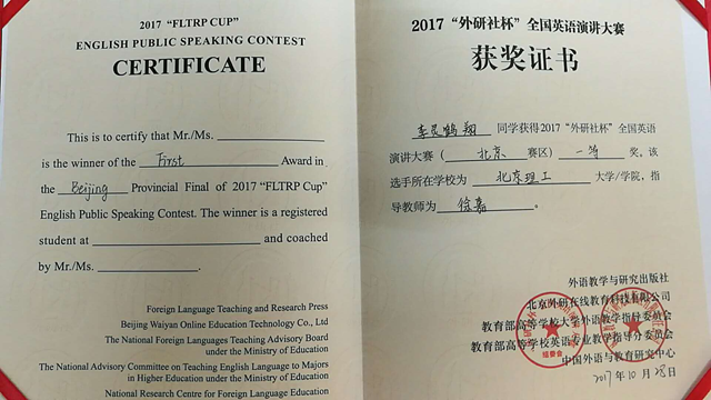 日前,2017年“外研社”杯全国英语演讲比赛北京赛区的决赛在北京林业大学举行,开云kaiyun官网选送校内选拔赛特等奖选手李灵鹤翔和指导教师外国语学院徐嘉老师前往参赛。经过三个小时的激烈比拼,北理工选手李灵鹤翔喜获北京赛区一等奖。