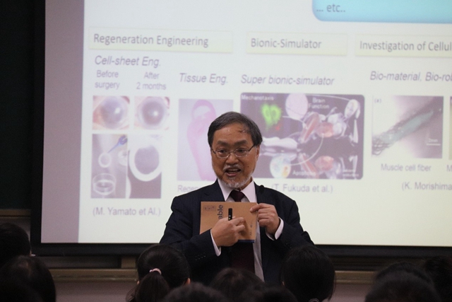 福田敏男院士的讲座内容丰富,生动活泼。他围绕机器人系统的设计与控制进行了细致讲解,并结合大量视频,为大家展示了机器人领域最前沿的科研成果。报告中还着重介绍了微纳机器人的原理、关键技术、发展现状以及未来在生物、医学等领域的广阔应用前景,多数成果都来自福田敏男院士本人的实验室,因而他对此如数家珍,深入浅出的讲解引起同学们阵阵共鸣。