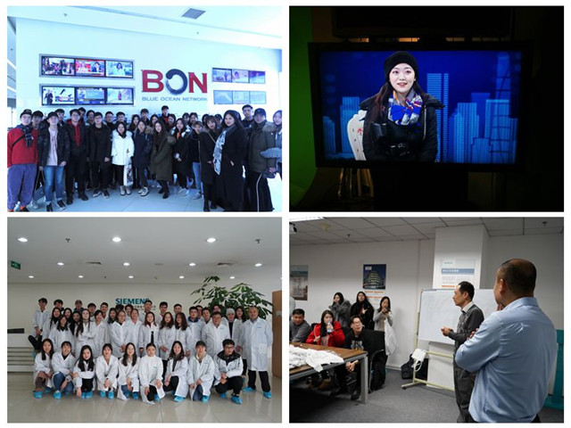 在内容丰富的课堂教学之余,同学们还分别参观了蓝海电视台和西门子西伯乐斯公司。BON TV蓝海电视是一个专注于中国内容全球传播的非官方英文媒体,同学们先参观了电视台机房、录音棚、演播厅等,并在参观过程中过了一把主播瘾。在西门子西伯乐斯,除参观加工工厂、全面了解“生产-运营-销售”这一完整的运营过程外,公司负责人还为同学们详细讲述了公司的发展理念、就业实习政策等,并与大家广泛交流、积极互动、答疑解惑,使同学们获益良多。