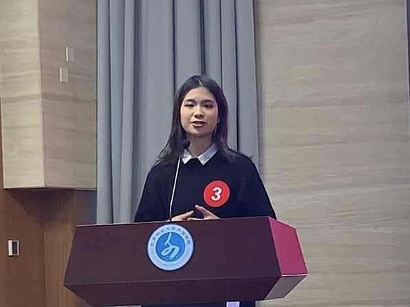 下午的决赛中,首先是本次大赛的定题演讲 “My big story in 2049:_______”,林紫欣将自身成为口译员的梦想与中国命运相结合,通过阐述口译在全球化过程中的作用,表达了自己传播中国文化、成为中国之声的美好愿景。在随后的即兴演讲与提问环节中,林紫欣反应迅速,要点清晰,逻辑缜密,井井有条,展示了超凡的思辨能力与英语表达能力。