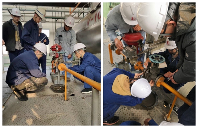 专业实习的重头戏是进入厂房实际操作整套对二甲苯工业生产装置。11月4日,大家首先熟悉了训练装置中压缩泵、反应器加热炉、精馏塔、换热器、离心泵等部件的工作方式与操作规程。随后,同学们分为两组进行实操训练。一组同学在中控室,通过DCS系统控制反应的进料、升温、出料等过程,另一组同学在装置现场,根据中控室指令,操作不同的泵机,并负责加热炉的点火、空冷器的启动等工作,在整个生产过程中还要定时进行室外巡检,以确保每一套装置都正常工作。经过两天的交换练习,每一位同学都对整个工艺流程的各个部分有了全面的了解,掌握了启动、运行、停止整套装置的方法。在最终的考核中,两组同学分别独立地操作了对二甲苯的生产装置,且都成功完成了开停车工作。