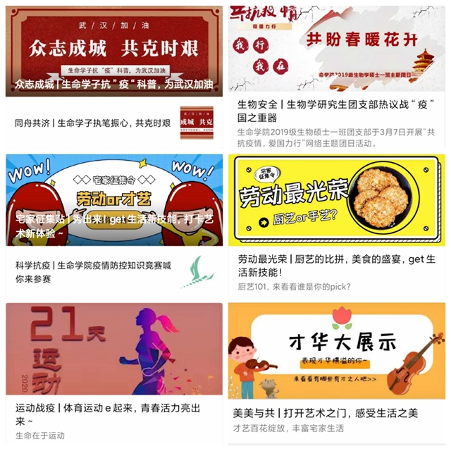 在此次网络主题教育活动中,广大生命学子纷纷结合自己的专业知识,通过一系列优秀的诗文、海报、剪纸、书法、绘画、视频动画等原创作品,助力战“疫”,为武汉加油,为中国加油。此次活动共收到学生们诗文40篇、海报10幅,画作21个,剪纸2幅、书法作品6个,视频80个、H5作品3个、表情包2组,学院借助新媒体手段,及时分享发布,展现青年学子的新时代正能量。