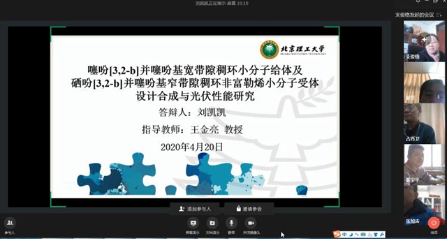 根据学校疫情防控相关工作要求,4月20日上午,化学与化工学院博士生刘凯凯以远程线上视频答辩的方式顺利完成了博士学位论文答辩。