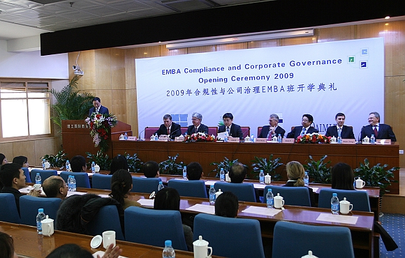 “合规性与公司治理”高级工商管理硕士(EMBA)班是我校与德国康斯坦斯应用科学大学和因戈尔施塔特应用科学大学合作举办的。该项目以“合规性与公司治理”为主题,旨在培养具有最高职业道德与娴熟国际商业活动运作规则的高级人才,为促进国际化公司本土化,进一步提升公司全球竞争力有着重要的现实意义和战略意义。出席第二期EMBA班开学典礼的还有:戴姆勒东北亚投资有限公司总裁Ulrich Walker先生、戴姆勒亚太地区人力资源部副总裁Walter Schaff先生,北京奔驰-戴姆勒•克莱斯勒公司德方总裁 Guenter Butschek先生、中方总裁蔡速平先生,德国HTWG康斯坦茨应用科学大学继续教育部主任Roland Luxemburger先生和德国英格尔斯塔特应用科学大学Thomas Doyé教授,我校国际交流与合作处王庆林处长、继续教育学院汪本聪书记。