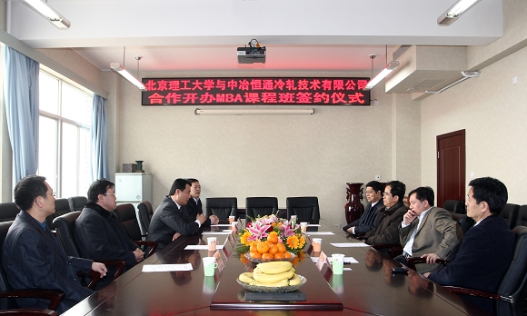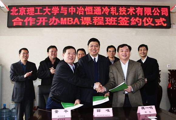 2009年3月4日,我校与中冶恒通冷轧技术有限公司在我校举行了合作开办MBA课程进修班签字仪式。中冶恒通冷轧技术有限公司韩继征董事长兼总经理、董平副总经理,我校副校长、研究生院院长孙逢春教授、研究生院薛唯常务副院长、管理与经济学院魏一鸣院长及相关部门负责人出席了仪式,仪式由管理与经济学院李金林书记主持。董平副总经理、薛唯教授和魏一鸣教授分别代表中冶恒通公司、研究生院和管理学院分别在合作协议书上签字。