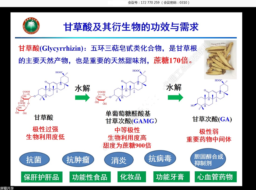 作为本次活动承办单位,开云kaiyun官网推荐路演的两个项目备受参会人员的广泛关注。来自化学与化工学院李春教授团队的吕波特别研究员分享了“甘草酸衍生物分子模拟筛选与制备项目”的相关情况。该项目通过分子设计和理论计算,给出基于甘草酸及其衍生物的候选小分子药物,可获得防疫新型冠状病毒侵染与减少炎症风暴的甘草酸结构衍生物。课题组具有多年研究积累,目前正在与某重点医药企业合作实施中试扩大,成果具有良好的转化应用前景。